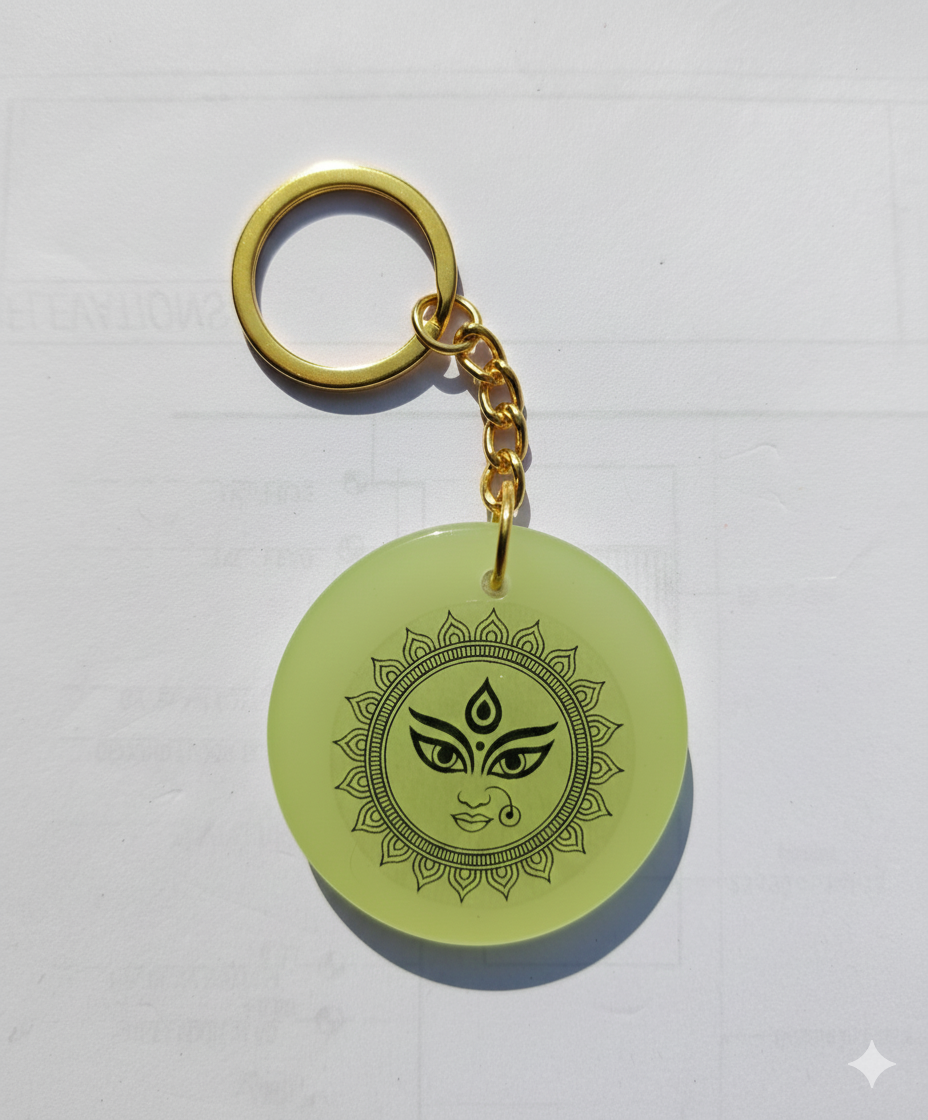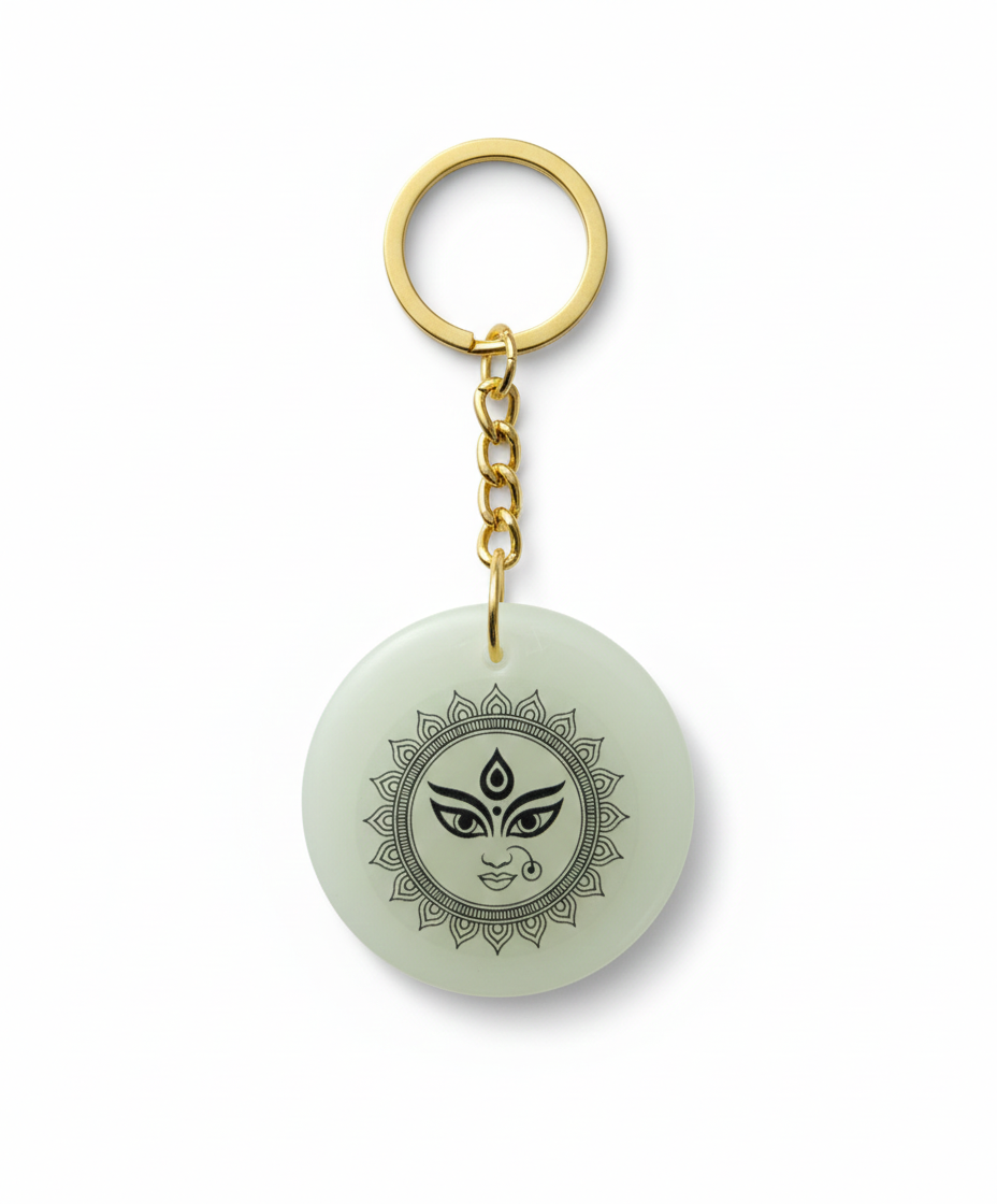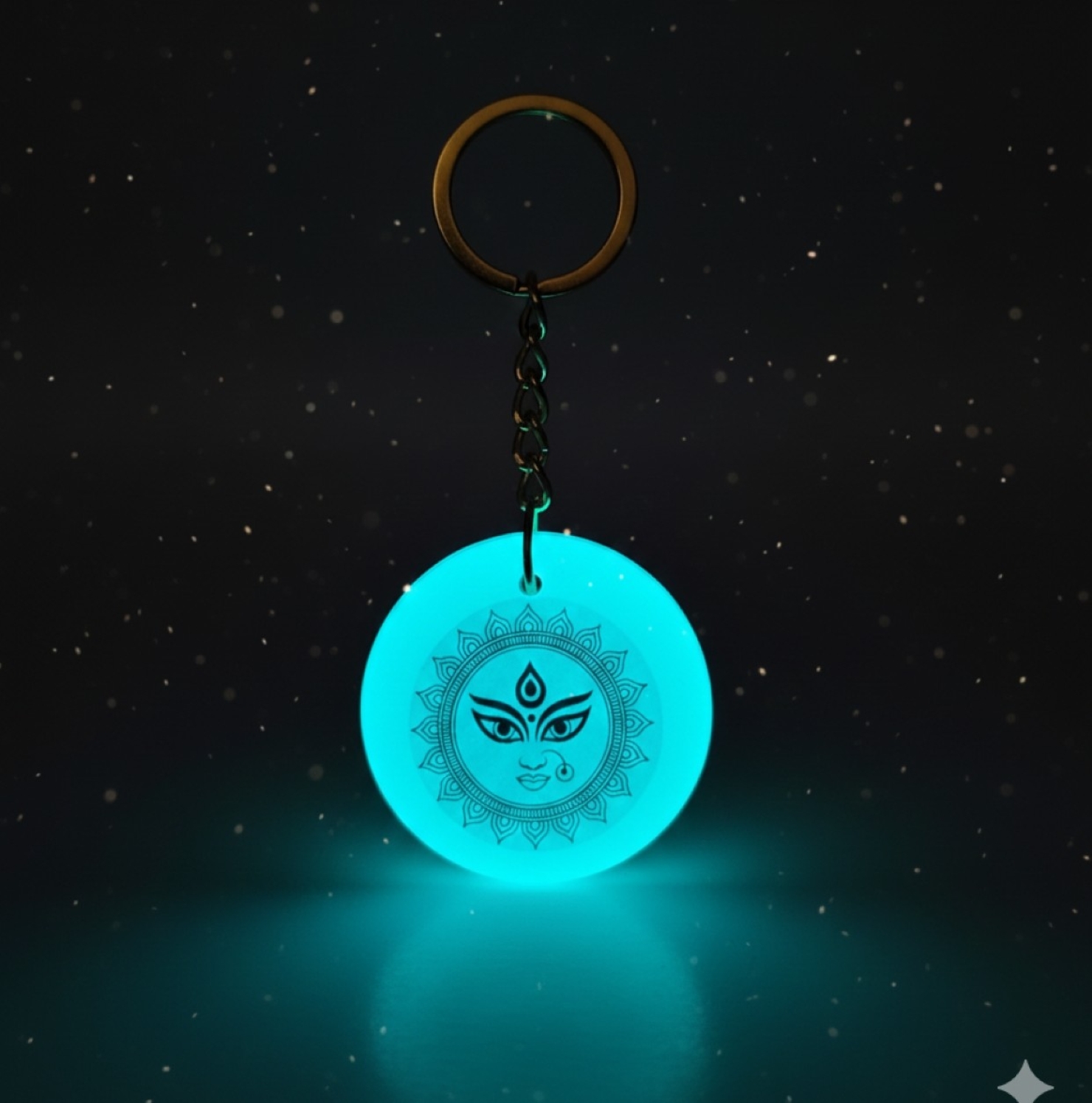 Bring divine protection and spiritual energy wherever you go with this Durga Maa Glow in the Dark Keychain. Designed with a beautifully detailed illustration of Maa Durga, this luminous keychain absorbs light and glows brightly in darkness, making it both spiritually meaningful and practically useful.